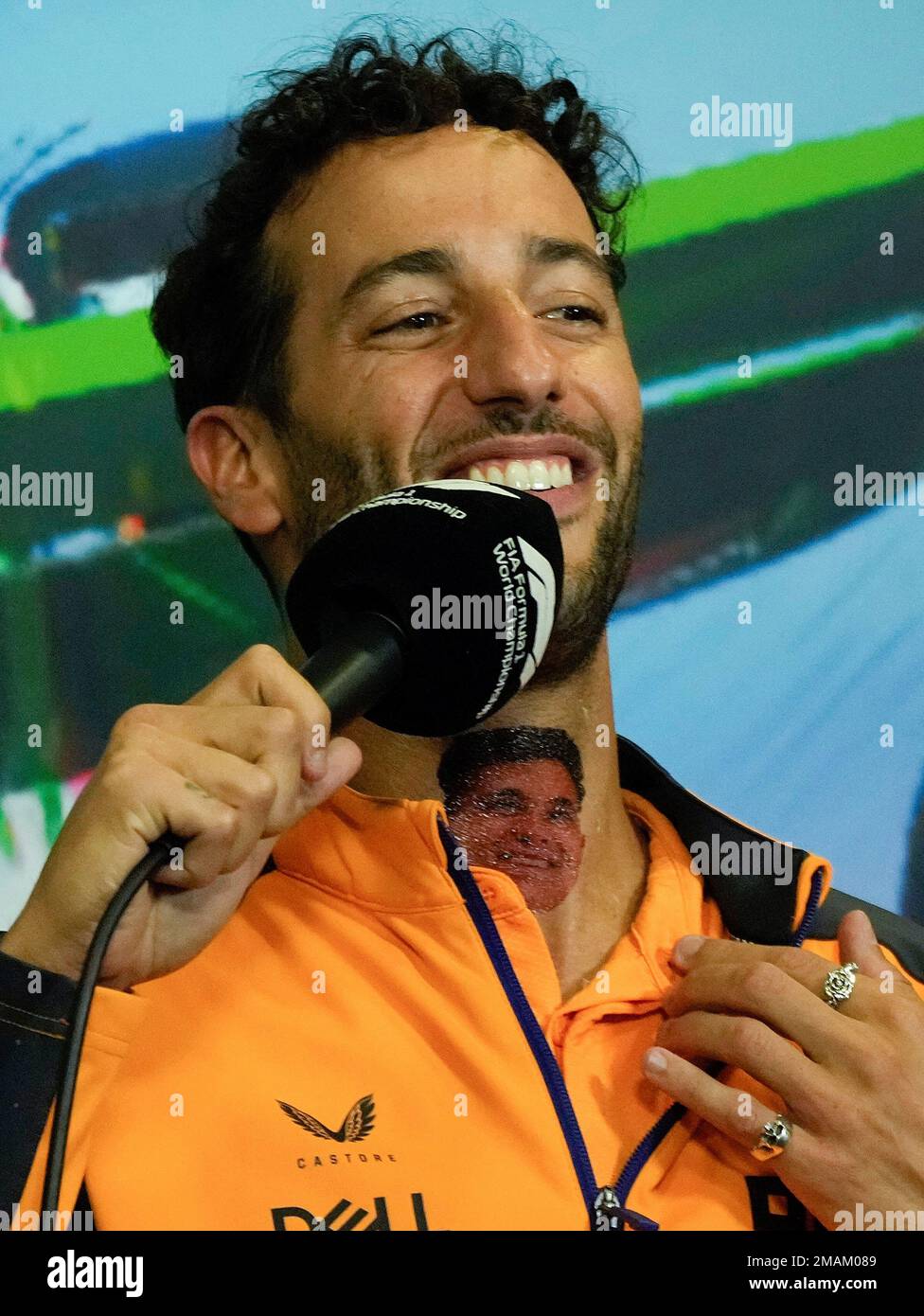 Mclaren Driver Daniel Ricciardo Of Australia Shows A Tattoo On His Neck Representing His Teammate Lando Norris During A News Conference At The Monza Racetrack In Monza Italy Thursday Sept 8 2022